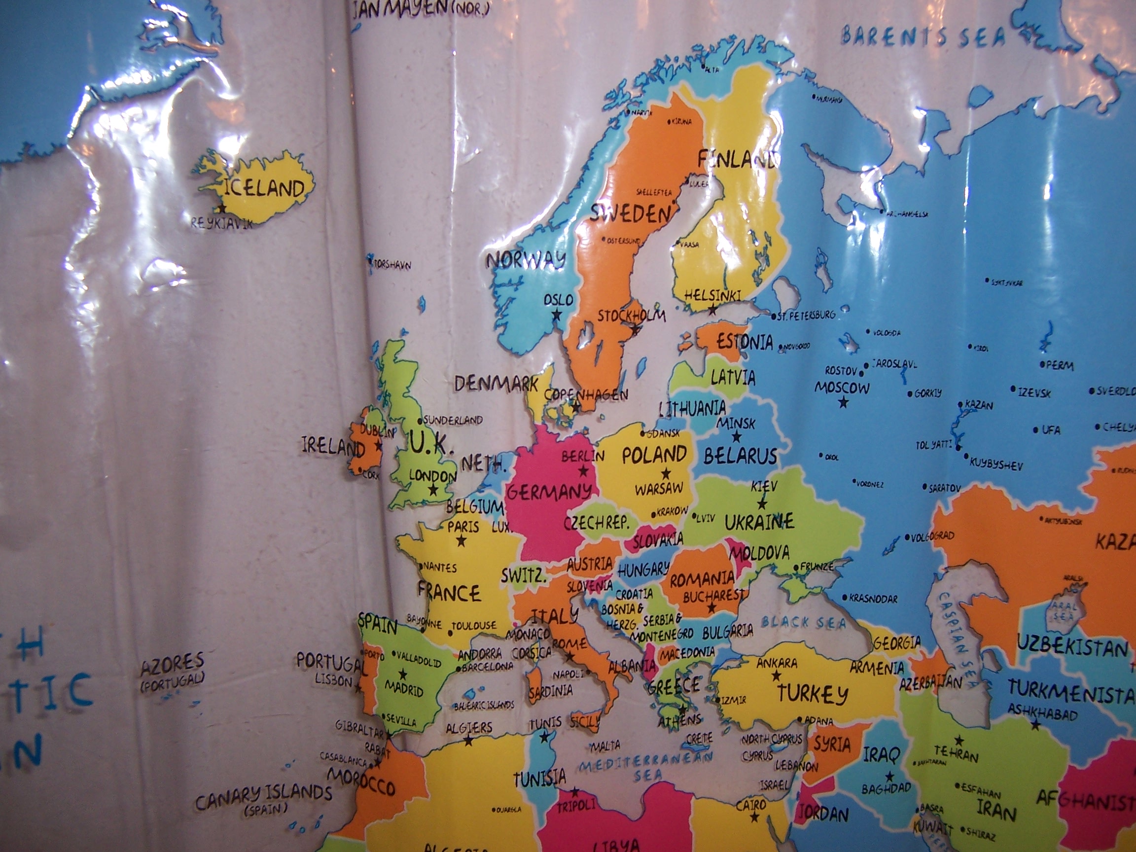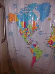 Allow me to get this out of the way right off the bat: I am not a cartographer. Sure, I may have a particular affection for the “Geography” section of Sporcle. And yes, I can spell Kyrgyzstan and know that Toronto isn’t the capital of Canada (even though it obviously should be). And I may have even drawn a map of the world from memory (along with everyone else in my class) as an end-of-year project in 7th grade. But those days are long past, and I have something significantly more important to tell you about: the bathroom users of this country are getting puzzling and inaccurate geographic information from one of the most popular shower curtains on the novelty shower curtain scene.