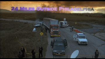 We are at the site of the truck explosion and the FBI is investigating the scene. One officer walks up to another inspecting a body and asks if this is body #6. The second officer replies that it’s “parts of bodies #2, #3, and #5” even though it is clearly a single person. An obnoxious news reporter reports the news obnoxiously, his cameraman has an Eastern-European accent.